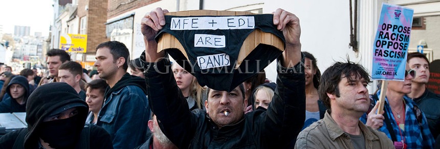 EDL-MFE march and counterprotest in Brighton 22-4-12 Local anti fascists mobilise in Brighton to disrupt a march by the racist March for England with their English Defence League supporters. There was several clashes with the Police throughout the day.